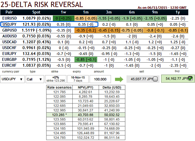 How to execute: Buy two lots of ITM 0.5 delta call with longer expiry (let's say 1m tenor). Sell 4D OTM strike calls (124.275) or even shorter expiries. Thereby, we've formulated the strategy so as to suit the delta risk reversal to take the advantage of overpriced calls by shorting.
