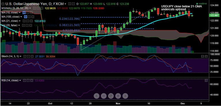 - USD/JPY broke below 21 DMA in yesterday's trade, falling to as low as 122.30. The pair ran through fresh bids near the mid-point of the 122 handle at Tokyo start.