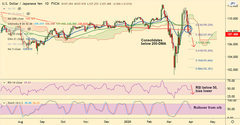 5-DMA is immediate resistance at 108.03. Bearish invalidation only above 200-DMA (108.30).