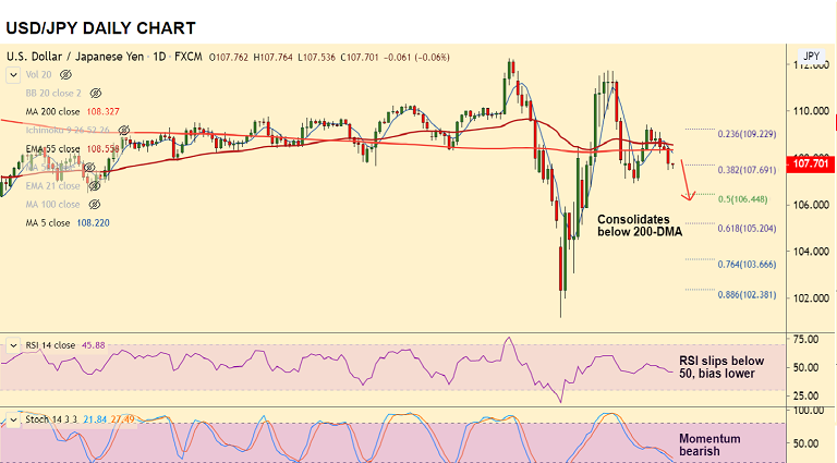 The major was consolidating break below 200-DMA, extending bearish run for the 4th straight session.
