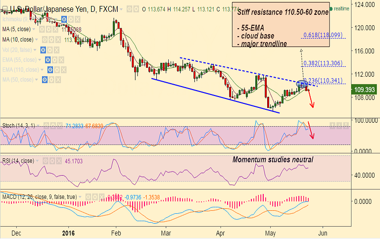 - The pair finds stiff resistance between 110.50-60 zone, 55-EMA (110.51), major trendline (110.50) and cloud base (110.57).