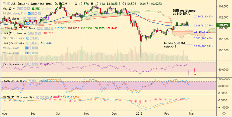 - On the flipside 110-EMA at 110.90 is strong resistance. Upside only on decisive break above.