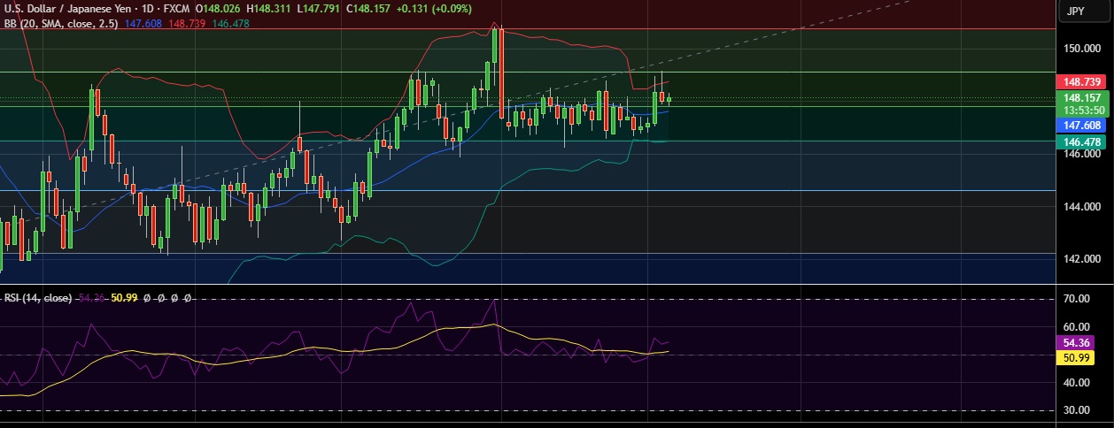 • Immediate resistance is located at 148.70(Higher BB ), any close above will push the pair towards 149.12 (38.2%fib).