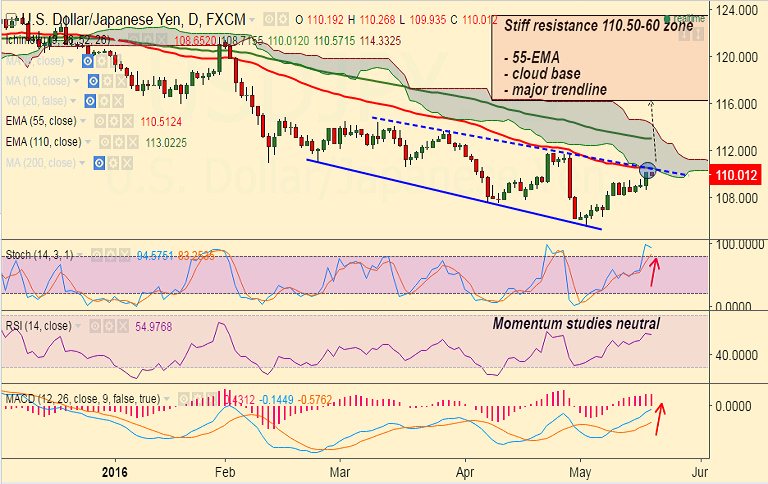 - The pair finds stiff resistance at the 110.50-60 zone, which is a combination of 55-EMA (110.51), major trendline (110.50) and cloud base (110.57).
