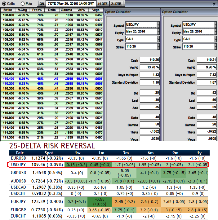 So, if you expect that USDJPY spikes in short run but tumble again towards recent lows, then the upswings offered by bulls is the right times for shorts in puts with shallow ITM strikes and shorter expiries.