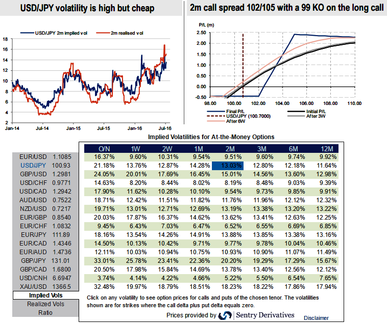 At spot ref: 101.06, initiate longs in USDJPY 2m call strike 102.50 knock-out 99, short 2m call strike 105.