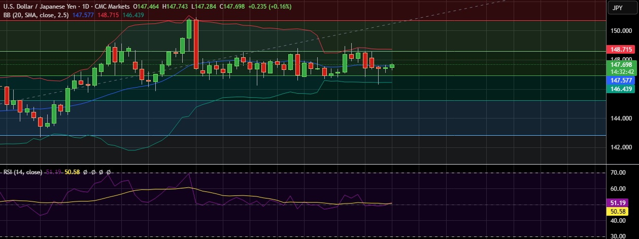 • Immediate resistance is located at 148.55(38.2%fib), any close above will push the pair towards 148.75 (Higher BB).