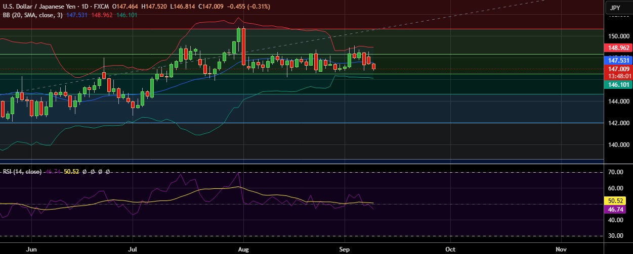 • Support is seen at 146.57(50%fib) and break below could take the pair towards 146.10 (Lower BB ).