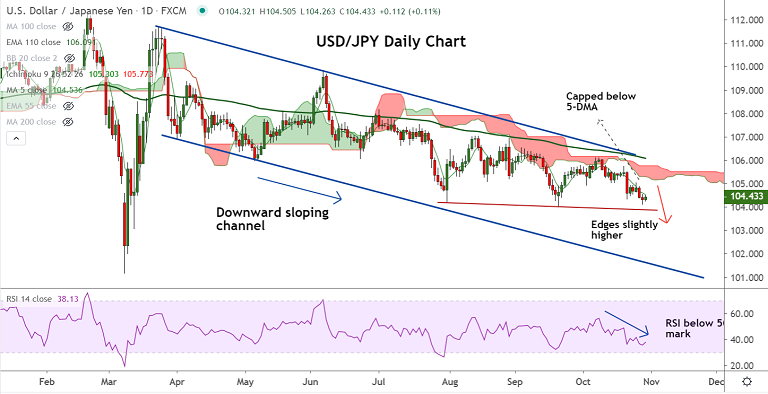 USD/JPY was trading 0.10% higher on the day at 104.42 at around 04:45 GMT. Technical bias is bearish. Resumption of weakness likely.
