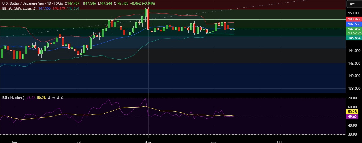 • Support is seen at 146.61(Lower BB) and break below could take the pair towards 146.30 (61.8%fib).