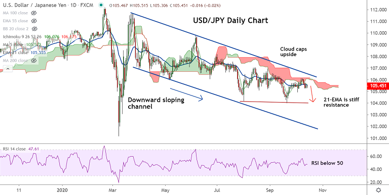 Technically, USD/JPY trades with a major bearish bias. Stiff, immediate resistance seen at 105.55 (21-EMA).