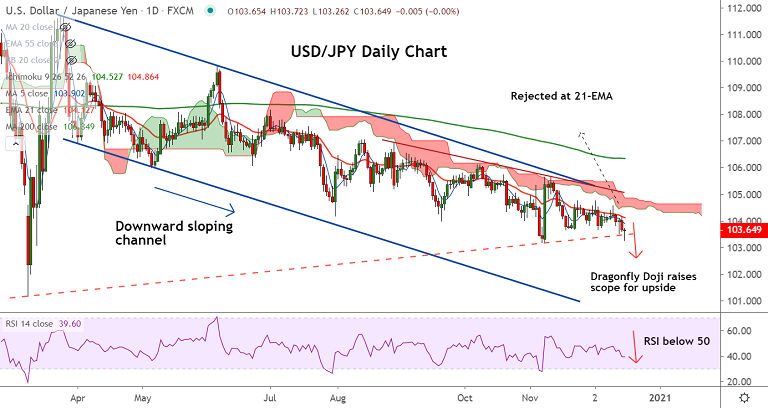 Technical bias for the pair is bearish, but Dragonfly Doji on the day's candle at the time of writing raises scope for some pullbacks.