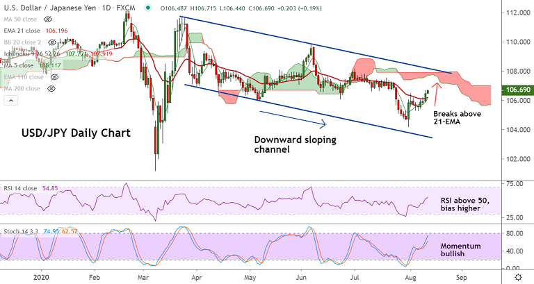 Summary: USD/JPY trades with a bullish bias. Oscillators are sharply higher. Breakout above 21-EMA raises scope for upside in the pair. Test of 110-EMA on cards.