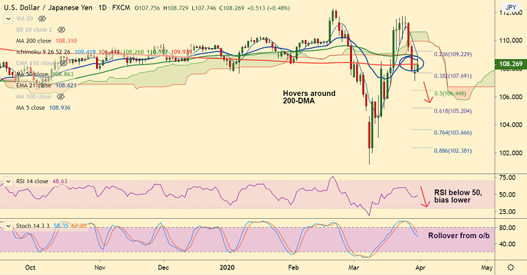 Resistance levels - 108.31 (200-DMA), 108.62 (21-EMA)