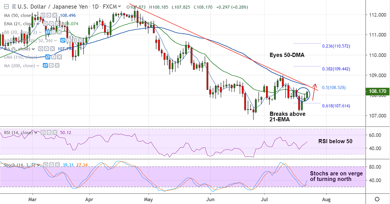 Resistance levels - 108.49 (50-DMA), 108.77 (cloud base), 109 (July 10 high)