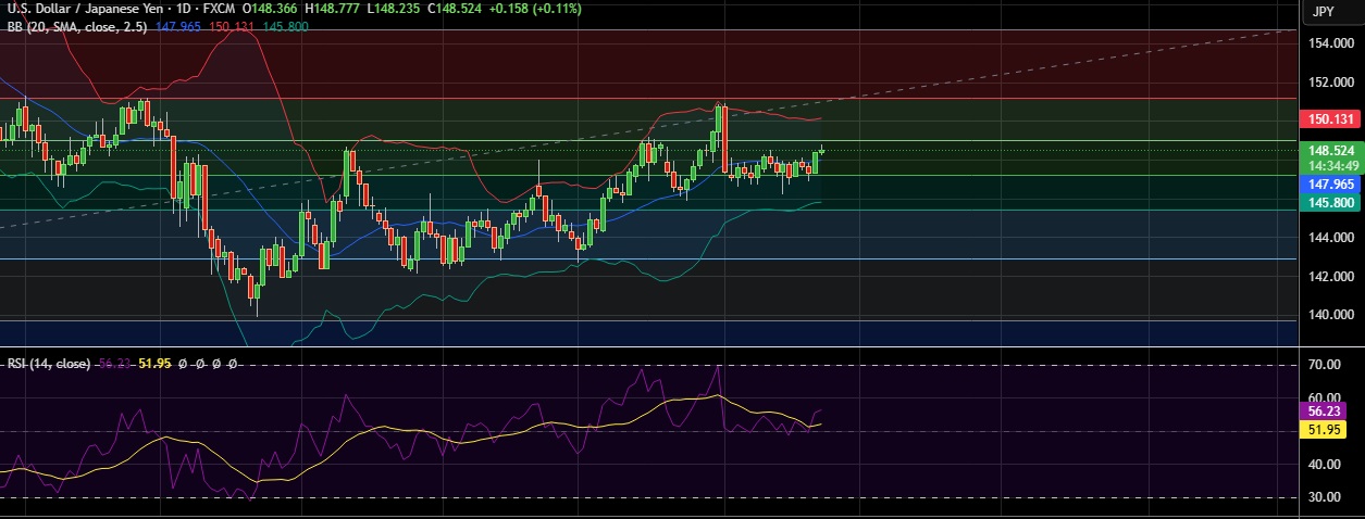 •At GMT 06:23 the dollar was up 0.12% to 148.54 against the Japanese yen.