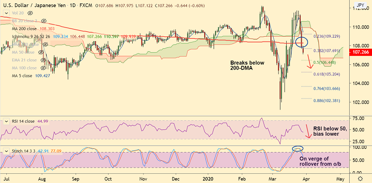 Technicals too support weakness for the pair. Price action has slipped below 200-DMA. Oscillators are on verge of rollover from overbought levels.