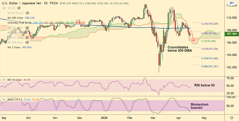 Major supports align at 106.70 (cloud top), 106.44 (50% Fib) and 105.20 (61.8% Fib). Retrace above 200-DMA negates any bearish bias.