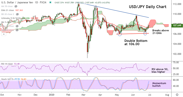 Technical indicators on the daily charts are slightly bullish. Stochs and RSI are biased higher. Break above 110-EMA will see gains till 200-DMA.