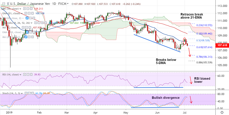 Resistance levels - 107.92 (5-DMA), 108.13 (21-EMA), 108.52 (50% Fib)