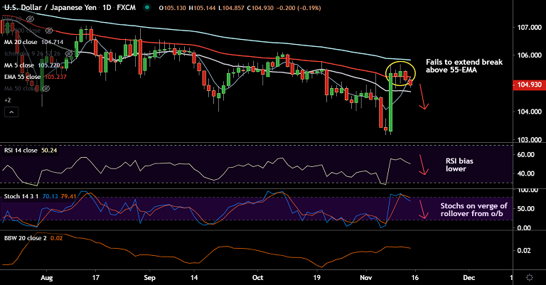 RSI has turned and Stochs are showing a bearish rollover from overbought levels. The pair is currently holding support at 21-EMA at 104.85.