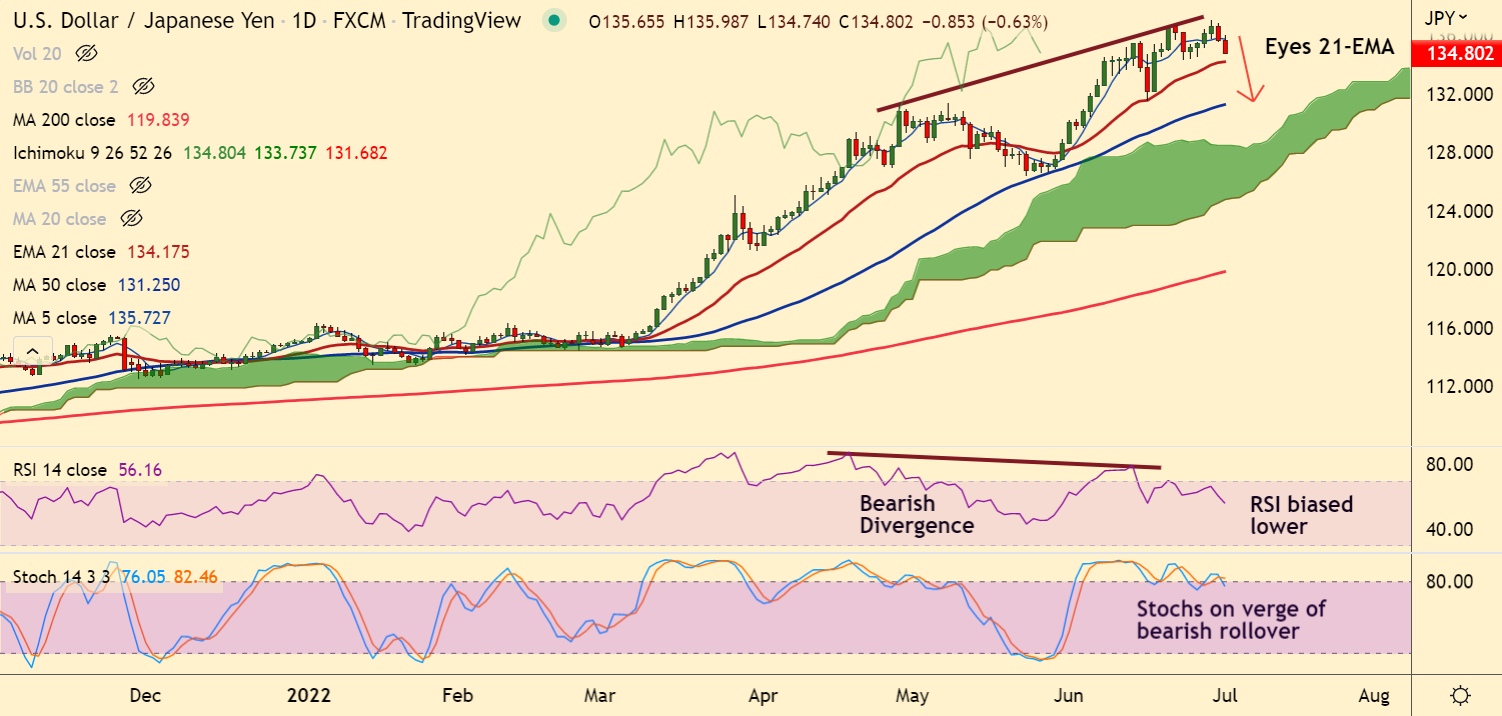 Summary: USD/JPY trades with a bearish bias. The pair is on track to test 21-EMA at 134.18.