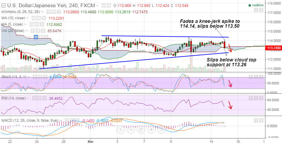 - USD/JPY hit session lows at 113.29, and has slipped further as we write to break below cloud top support at 113.26.