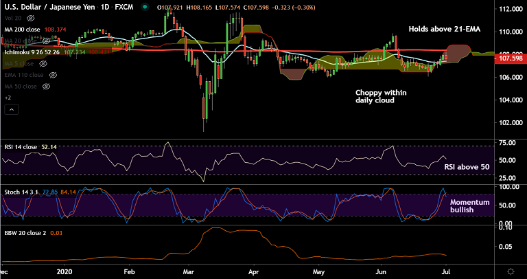 The pair was trading 0.26% lower on the day at 107.64 at around 05:00 GMT, bias neutral.