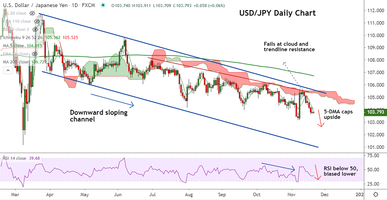 Minor support for the pair is seen at 103.17 (Nov 6th low). Break below finds little support till 101.70 (Trendline).