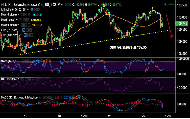 - Hourly charts show stiff resistance at 109.95 levels (1H 50&10-SMAs), intraday bias is lower.