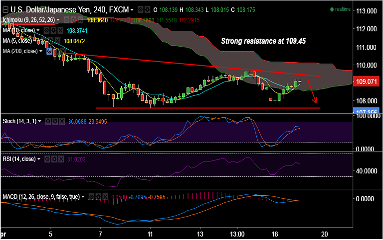 - Supports are located at 108.78 (10-DMA), 108.65 (4H cloud base) and then at 108.50 (Apr 13th lows).