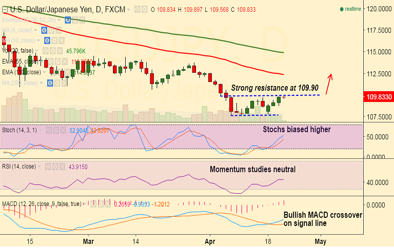 - Immediate support and resistance are located at 109.27 (5-DMA) and 109.90 (trendline and Apr 7th high).