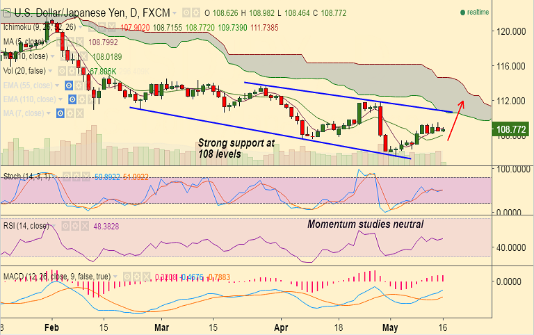 - Techs support upside in the pair, major support lies at 108 (Psychological level and 10-DMA ), while major resistance is seen at 108.81 (21 day MA).