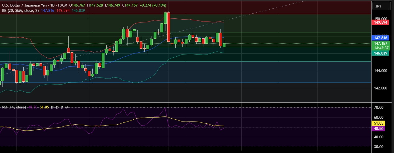 • Support is seen at 146.74(50%fib) and break below could take the pair towards 146.02(Lower BB.