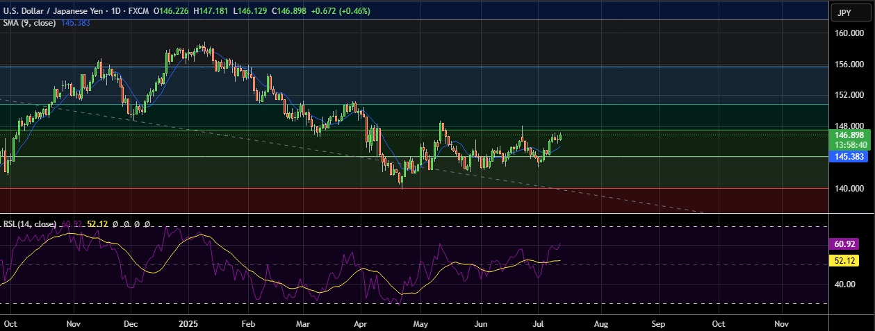 • Support is seen at 145.35(SMA 9) and break below could take the pair towards 145.00 (Psychological level).