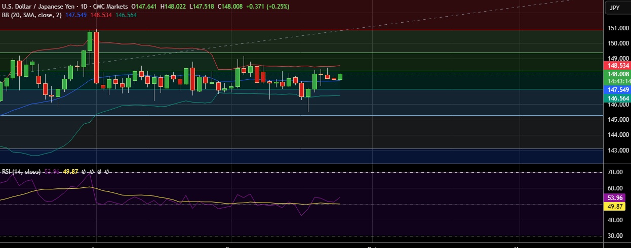 • Immediate resistance is located at 148.14(38.2%fib), any close above will push the pair towards 148.59(Higher BB).