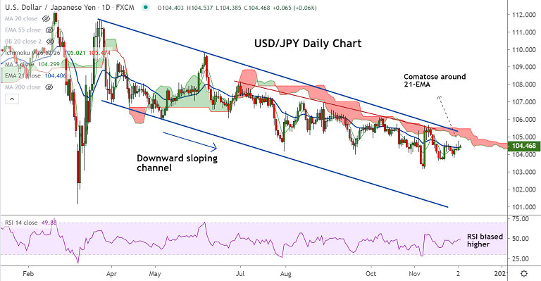 USD/JPY extends range trade along 21-EMA, with session high at 104.53 and low at 104.38.