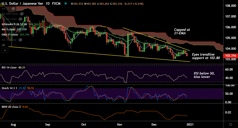 USD/JPY slides lower for the 2nd straight session, hits 6-day lows at 103.26, outlook bearish.