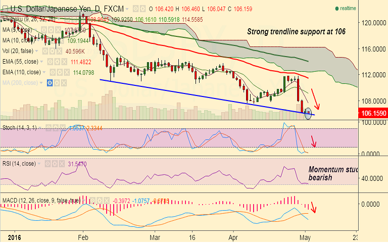 - Pair finds support by trendline at 106 levels, breaks below will drag the pair to 105.50 levels.