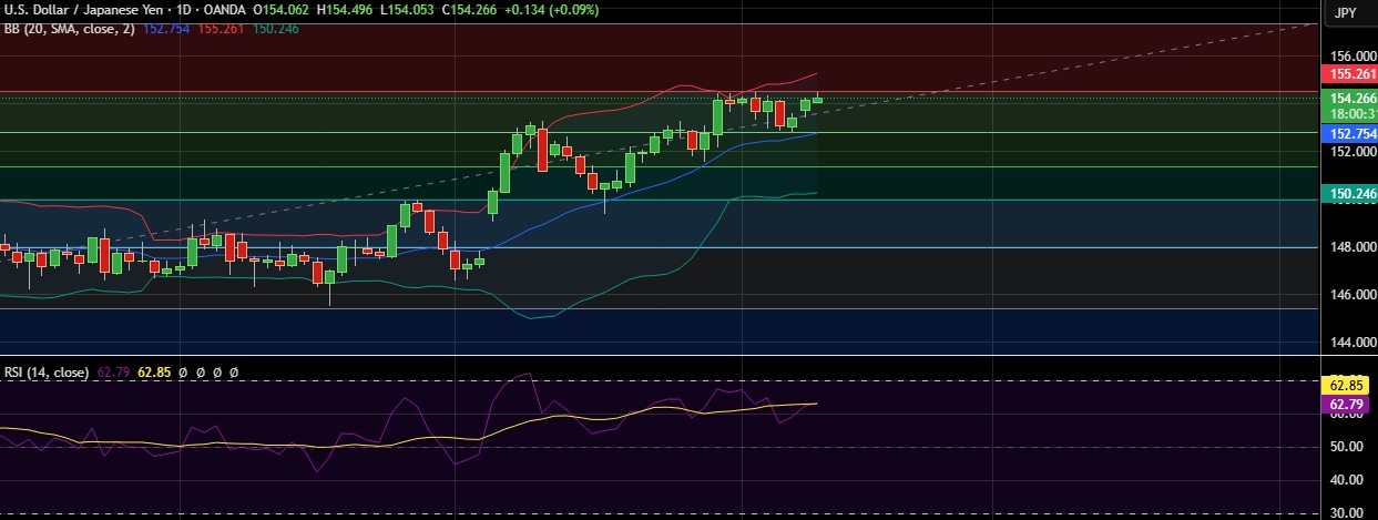• Immediate resistance is located at 154.52(23.6%fib), any close above will push the pair towards 155.31(Higher BB).