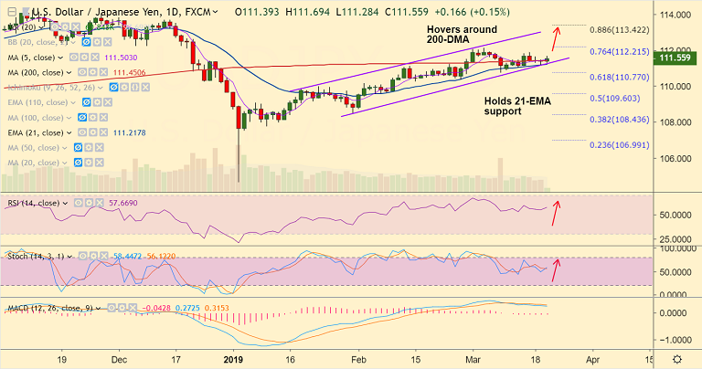 Support levels - 111.45 (200-DMA), 111.21 (21-EMA), 110.92 (55-EMA)