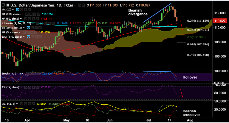 • The pair has broken below 20-DMA and 23.6% Fib to hit 2-week lows of 110.75 before paring some losses to currently trade at 110.93.
