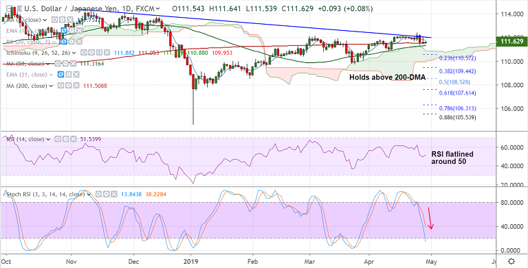 - Below 200-DMA the pair finds serious of strong support till daily cloud at 110.88. Break below cloud top to see further weakness.