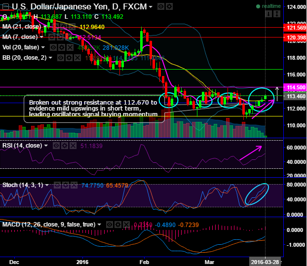 After taking major support at 111.041, it has now broken out strong resistance at 112.670 (see circled areas where it has acted as strong zone of supply and demand at this juncture) to evidence mild upswings in short term, leading oscillators signal buying momentum.