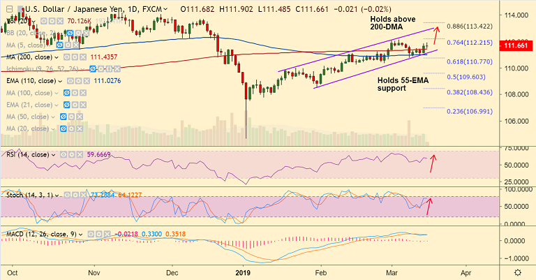 Support levels - 111.43 (200-DMA), 111.02 (110-EMA), 110.77 (61.8% Fib)
