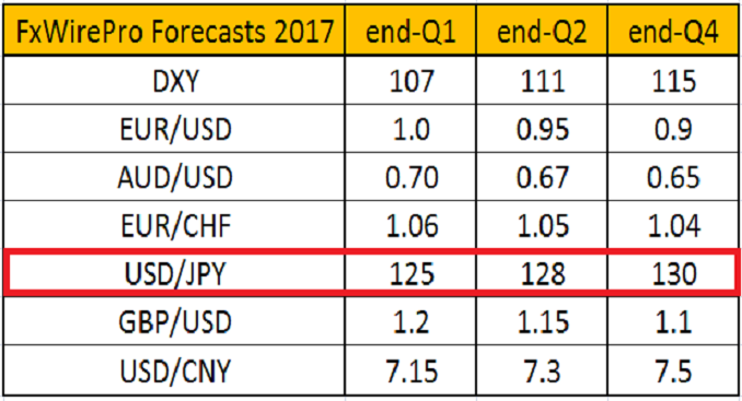 We foresee that the USD/JPY currency pair will test the 130 level towards the end of 2017, for the first time since April 2002. Also, the 10-year Treasury yield spread will likely widen, at over 250 basis points for the first time since 2010.