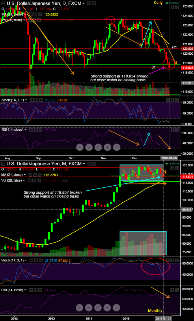 The pair has broken a strong support at 118.854 but the break below is keenly watched on closing basis, as it would build new bearish environment.