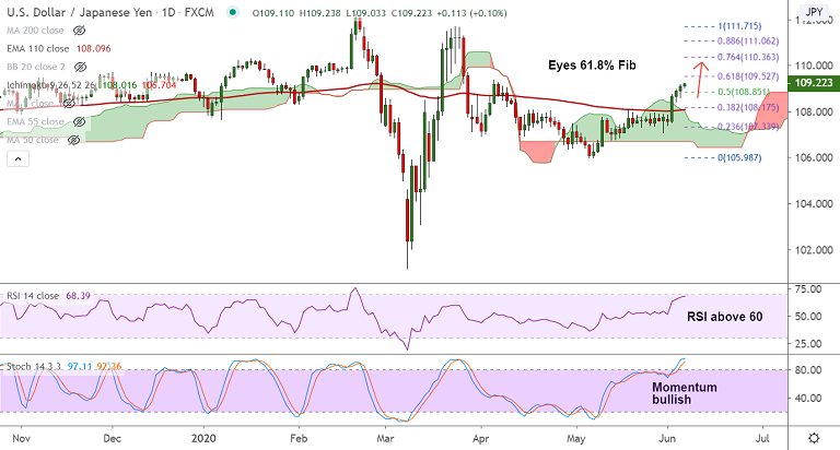 Technical analysis supports gains in the pair. Price action is extending gains above 200-DMA and cloud.