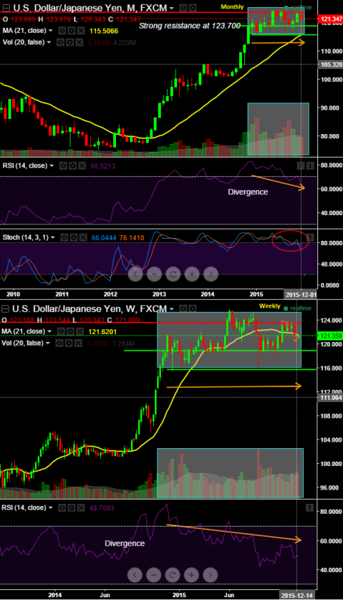 We observed from last one year the trend went in tight range between 123.850- 115.560 which we perceive this as non-directional but slightly downward bias since some bearish signals for long term along with short term upswings are popping up.