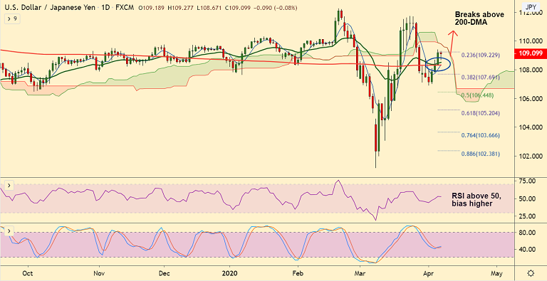21-EMA is immediate support at 108.50. Retrace below 200-DMA negates any bullish bias.